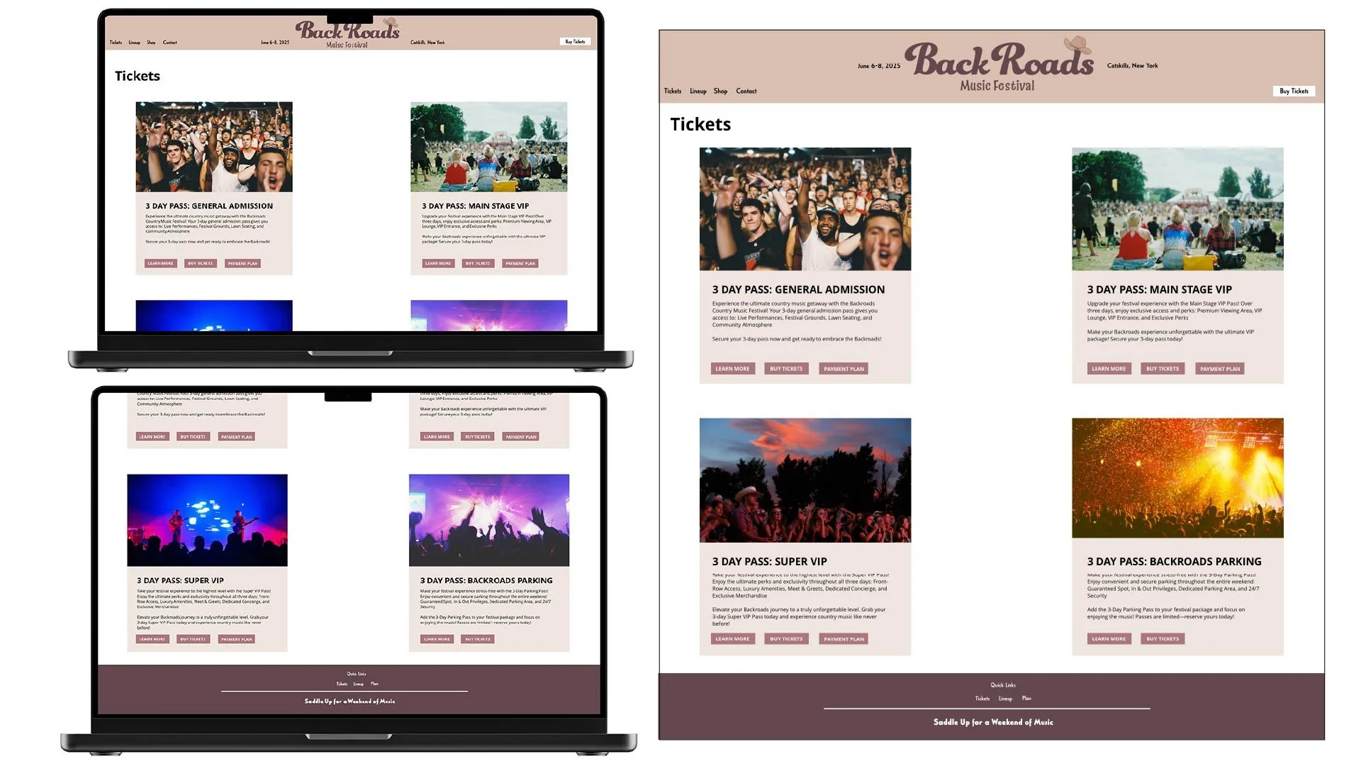 The conceptual development for the Backroads Music Festival branding centered on creating a visual identity that reflects community, connection, and the authenticity of country music. I had experimented with different types of imagery as well as color pallets, the branding’s visual design and is its ability to evoke authenticity, warmth, and connection, values at the heart of the Backroads Music Festival. The visual elements, such as rustic color palettes, and scenic/ country imagery, successfully convey the festival’s themes of community and the joy of music in a natural setting.